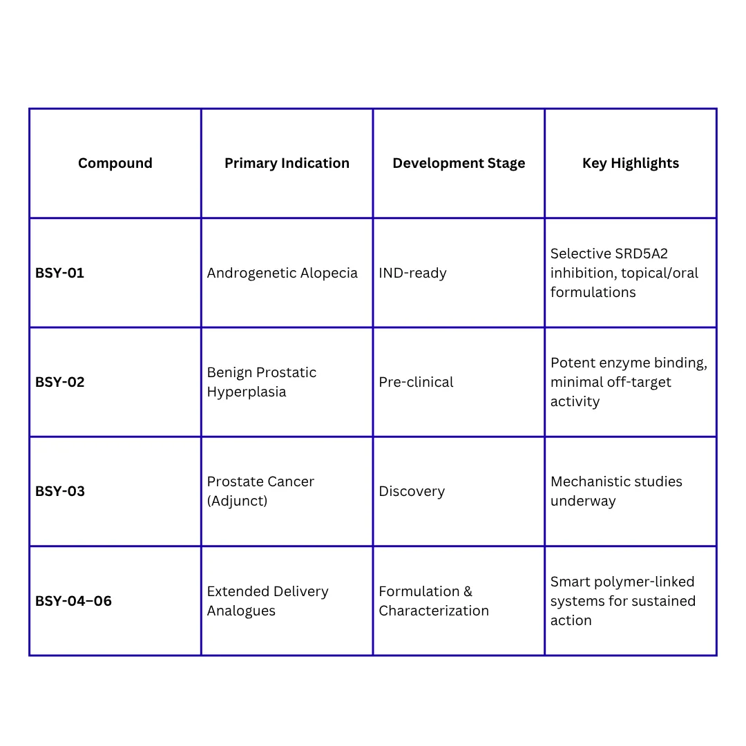 Building on our lead compound, we are developing a portfolio of six proprietary BSY analogues. Our pipeline is designed to refine therapeutic potential, optimize delivery, and expand into new indications.